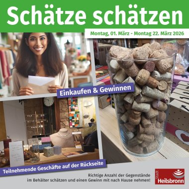 wandert ein durchsichtiges Gefäß durch die Geschäfte der Heilsbronner Innenstadt, in welchem sich „Schätze“ befinden. Wer es schafft die genaue Anzahl oder Menge der sich darin befindlichen Artikel zu erraten, bekommt einen Hauptgewinn. Bei einer Schätzgenauigkeit von +/- 10% werden ebenfalls Gewinne ausgegeben.